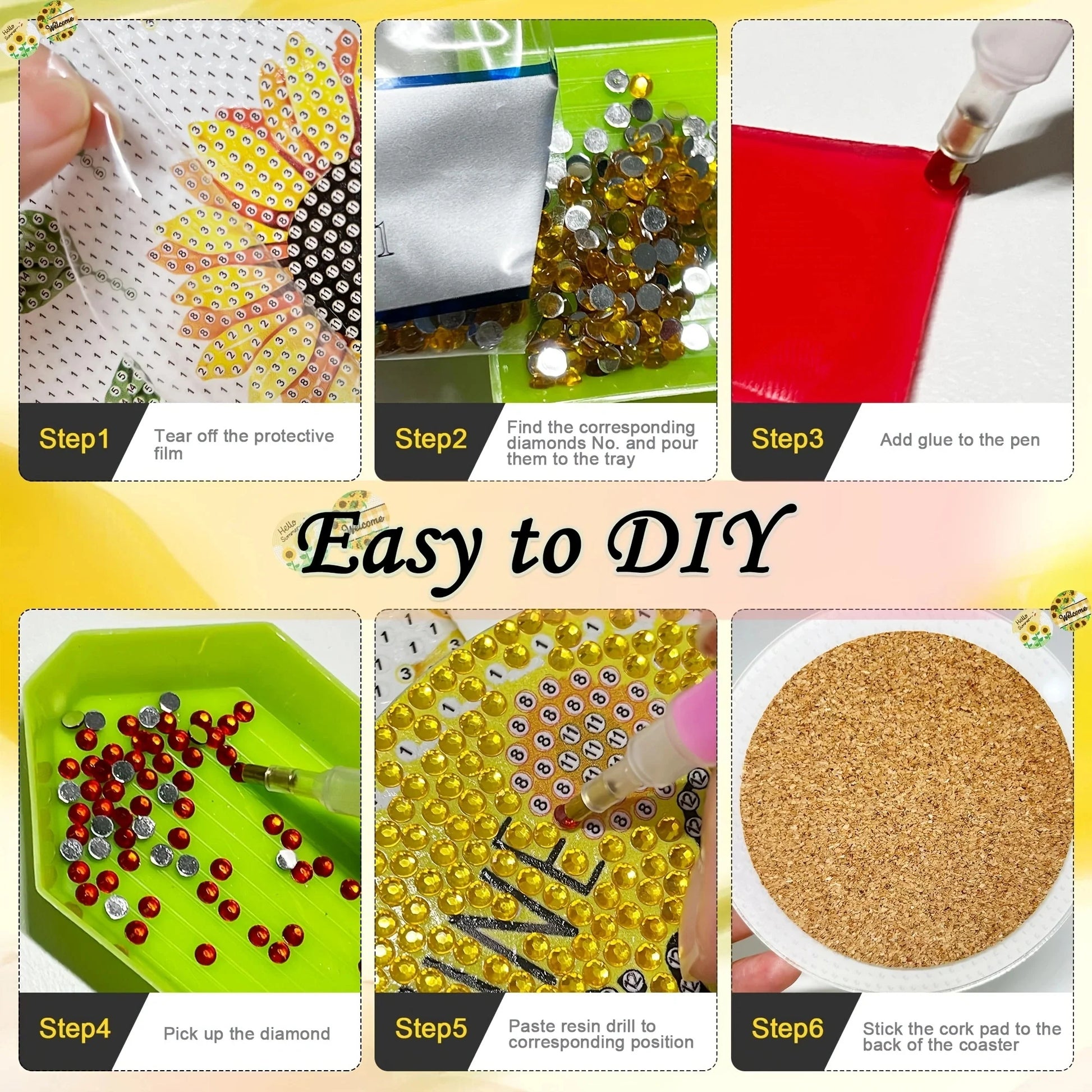 EASY TO OPERATE - Deze kit wordt geleverd met diamantschildergereedschap waarmee je zes onderzetters kunt maken. Scheur eerst de beschermfolie van de onderzetter, zoek dan de rhinestone die je nodig hebt volgens het nummer/de letter op de onderzetter (het corresponderende nummer/de letter is gemarkeerd op het zakje) om te beginnen met maken. Plak tot slot de kurklaag op de achterkant van de onderzetter.