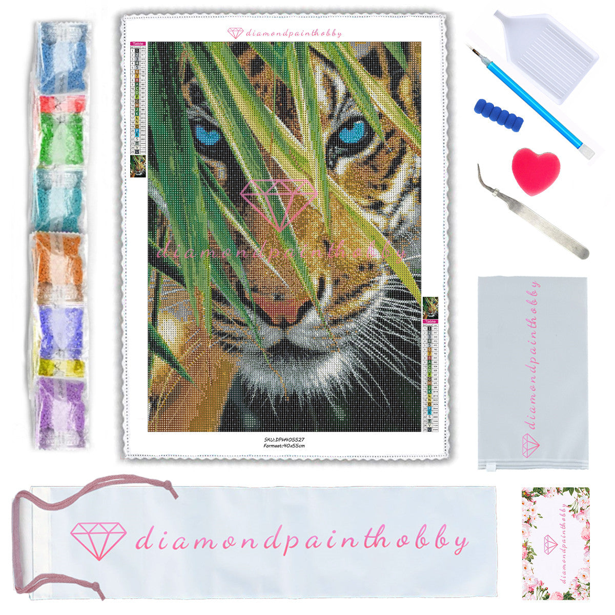 Onze pakketten bevatten alles wat u nodig hebt om meteen aan de slag te gaan met uw nieuwe kunstwerk. Inclusief een premium, fluweel canvas dat zachte, hoogwaardige kleurdiamanten voelt, een premium pen en wax.