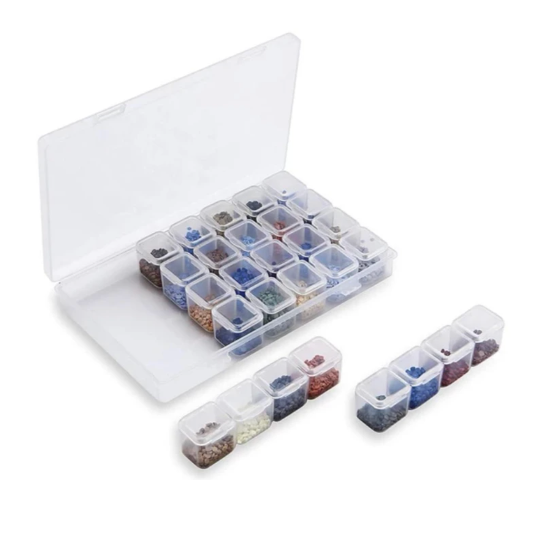 Super handige sorteerdoos om je steentjes in te sorteren en op te bergen. De box heeft 28 aparte potjes in rijen van 4 stuks aan elkaar met klikdekseltjes.